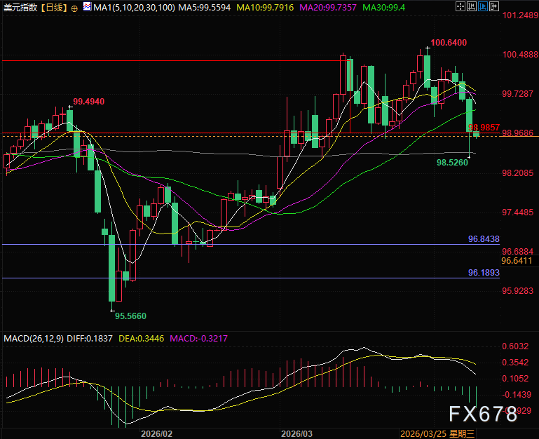 (美元指数日线图,来源汇通财经旗下易汇通)北京时间21:02,美元指数现报98.91。